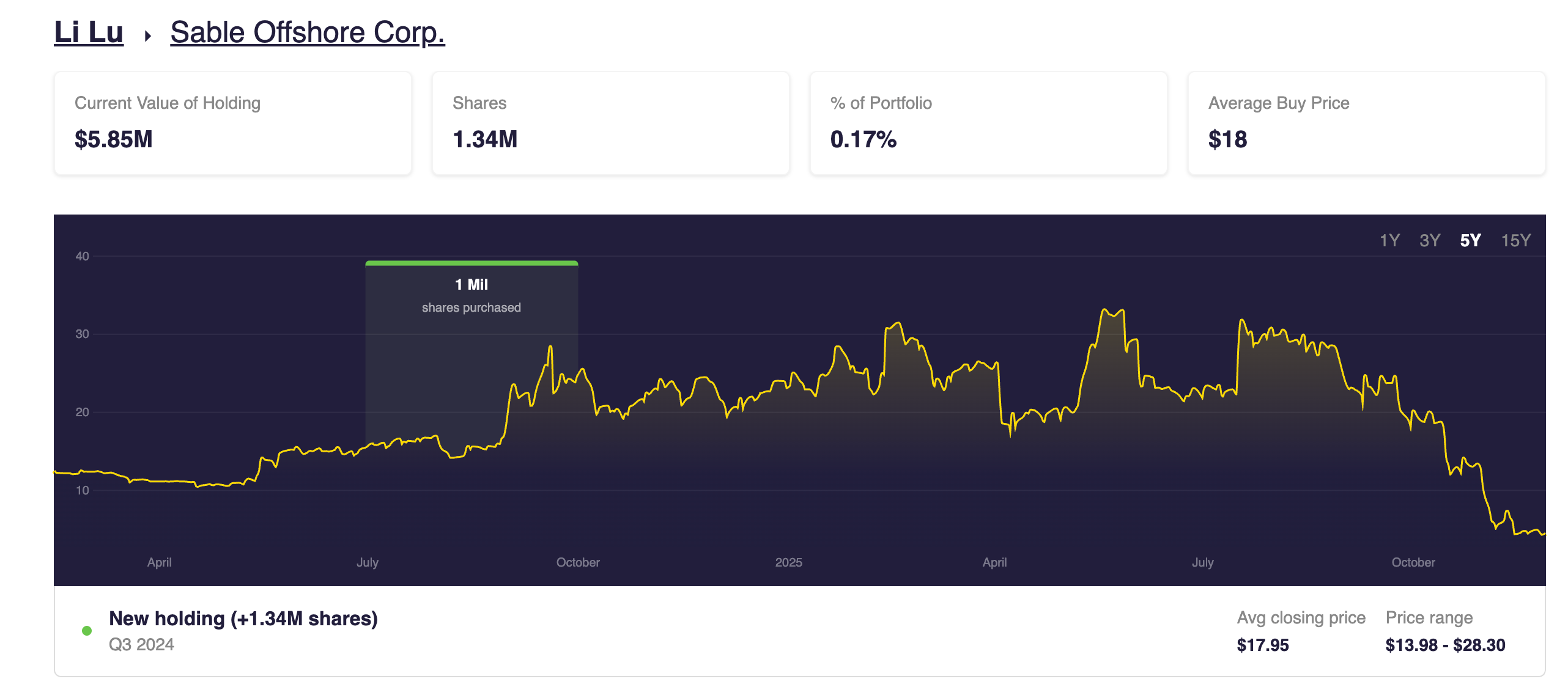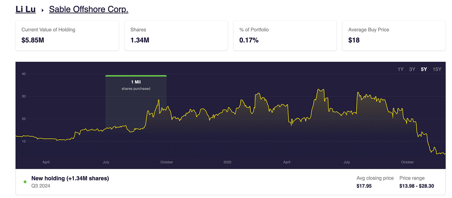 And here’s the detail that truly grabbed my attention. In the summer of 2024, Li Lu bought 1.34 million shares of Sable Offshore Corp. at an average price of about $18 per share.