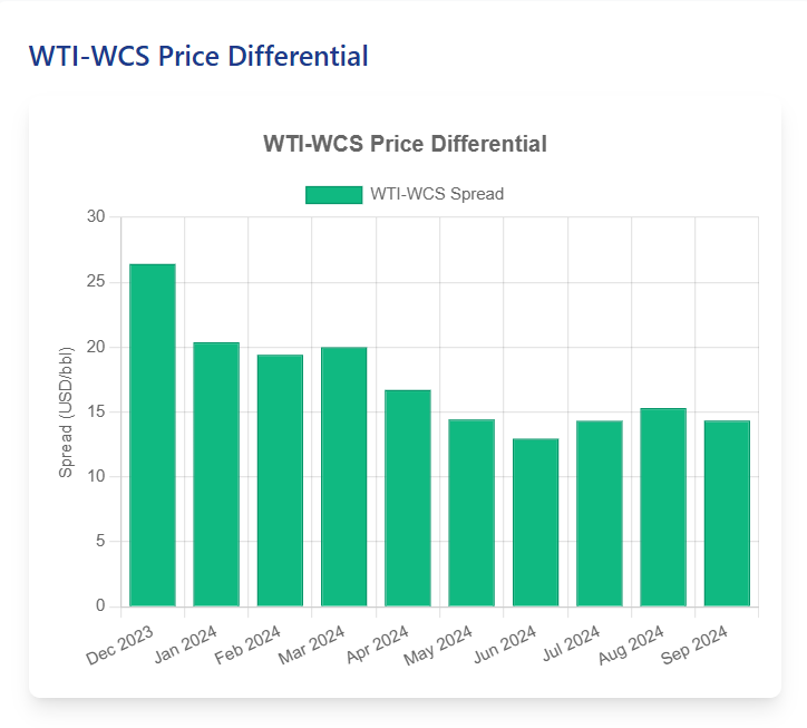 TMX has reduced extreme price swings and removed export bottlenecks that once caused big discounts, like the 2018 –$40/bbl spread. Even with rising production, there is no sign of a structural problem. In short, TMX didn’t cause a short-term squeeze but stabilized the market. The WCS–WTI spread is not collapsing; it’s normalizing around $12–14, a healthy and sustainable range driven by better infrastructure, not overheated demand.