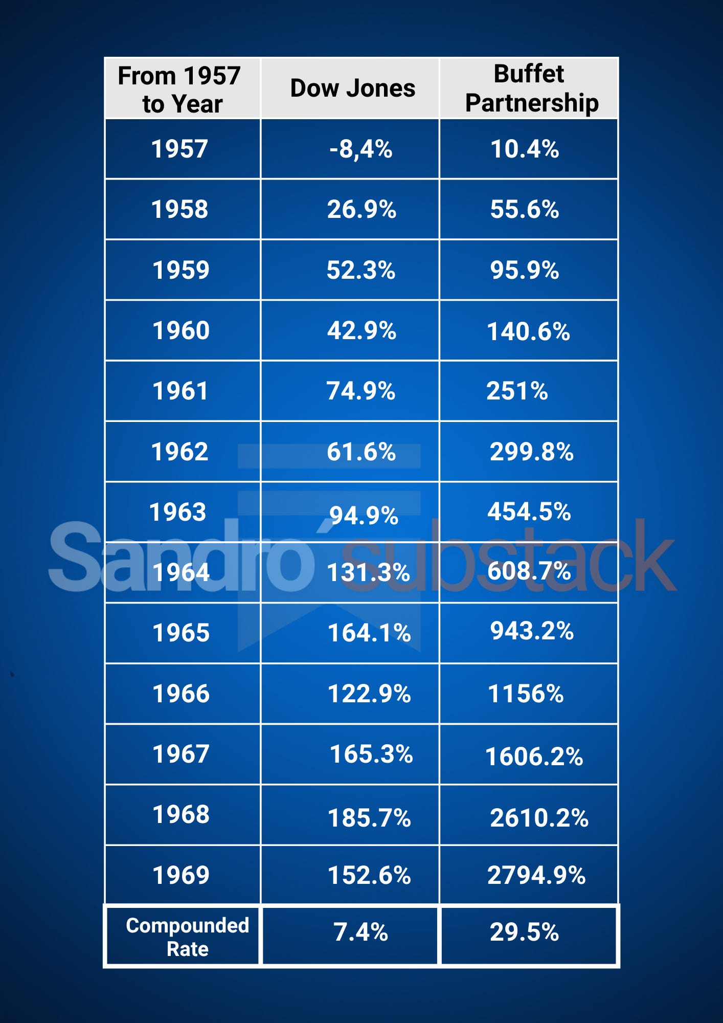 Between 1957 and 1969, his partnerships compounded at 29.5% per year, turning $1,000 into nearly $26,000, while the Dow Jones barely moved. Buffett wasn’t just beating the market — he was obliterating it.