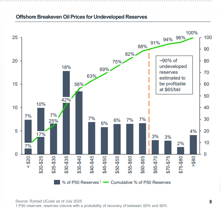 If another crisis hits, such a massive release simply cannot be repeated — the barrels aren’t there anymore. That’s why I believe the downside risk for oil is limited. And importantly, ~90% of offshore reserves remain profitable at around $65/bbl (see chart).