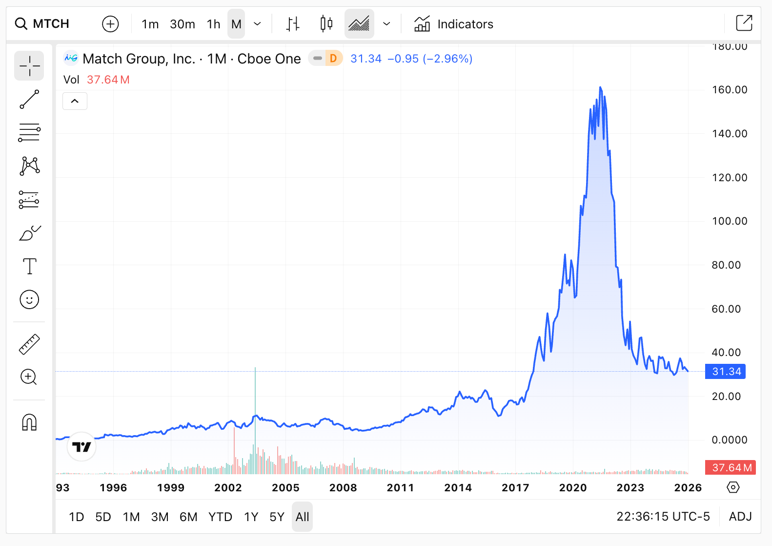 Growth was strong for years. Tinder compounded at roughly 40% annually over a five-year stretch. Then growth slowed to about 9% last year and the stock collapsed.