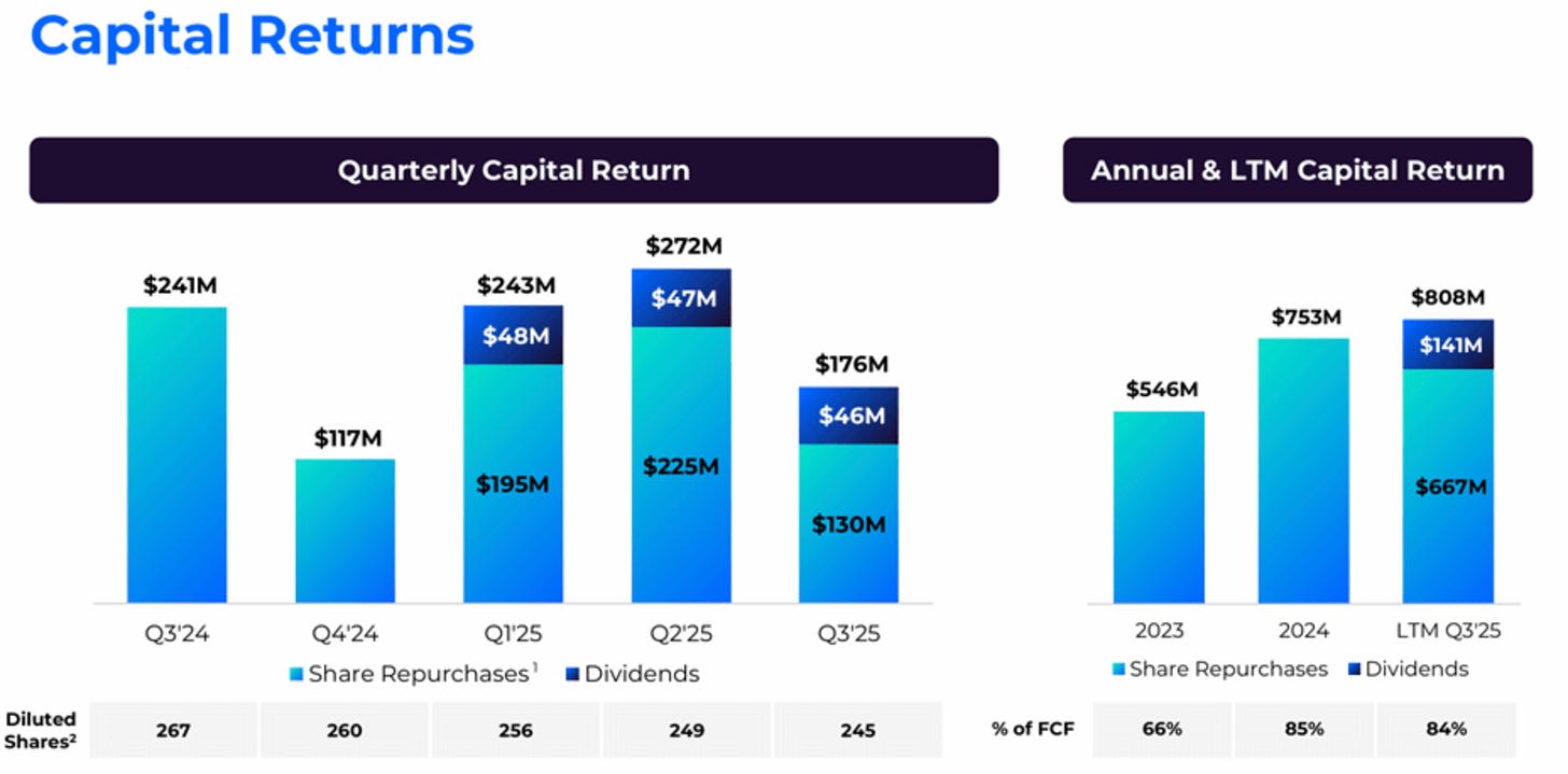 Buybacks are the main tool. Dividends are secondary, but steady, running around $140 million per year.