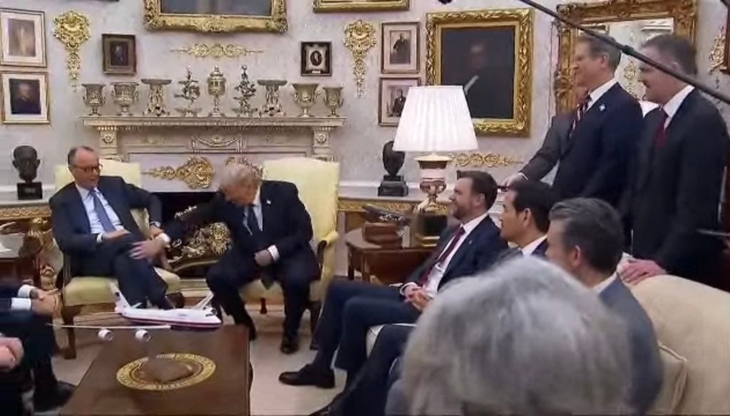 On March 3rd, Trump sat knee-to-knee with German Chancellor Merz in the Oval Office. At one point he turned to his advisors and asked — half joking, half not — “How are we going to treat Germany? I think we should hit them very, very hard.” Then he slapped Merz on the leg. Merz smiled and shook his head. That image tells you everything about where Europe stands right now.