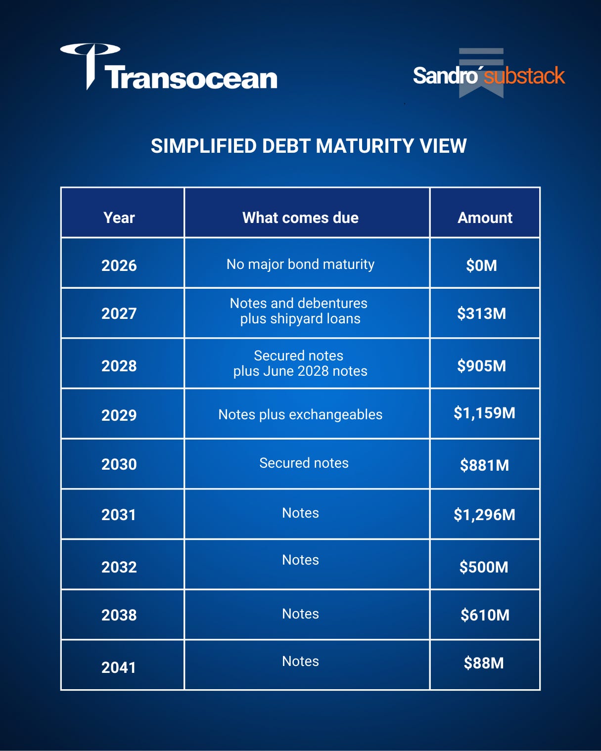 In October 2025, Transocean removed the February 2027 maturity, roughly $903 million. That was the real danger point. If that wall stayed in place, everything else in the story would be secondary.
