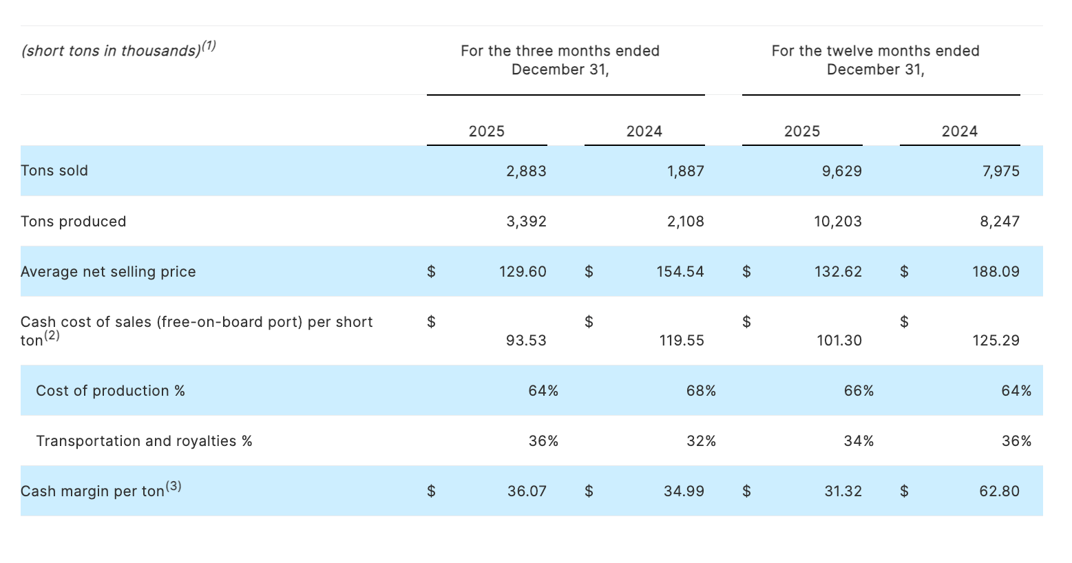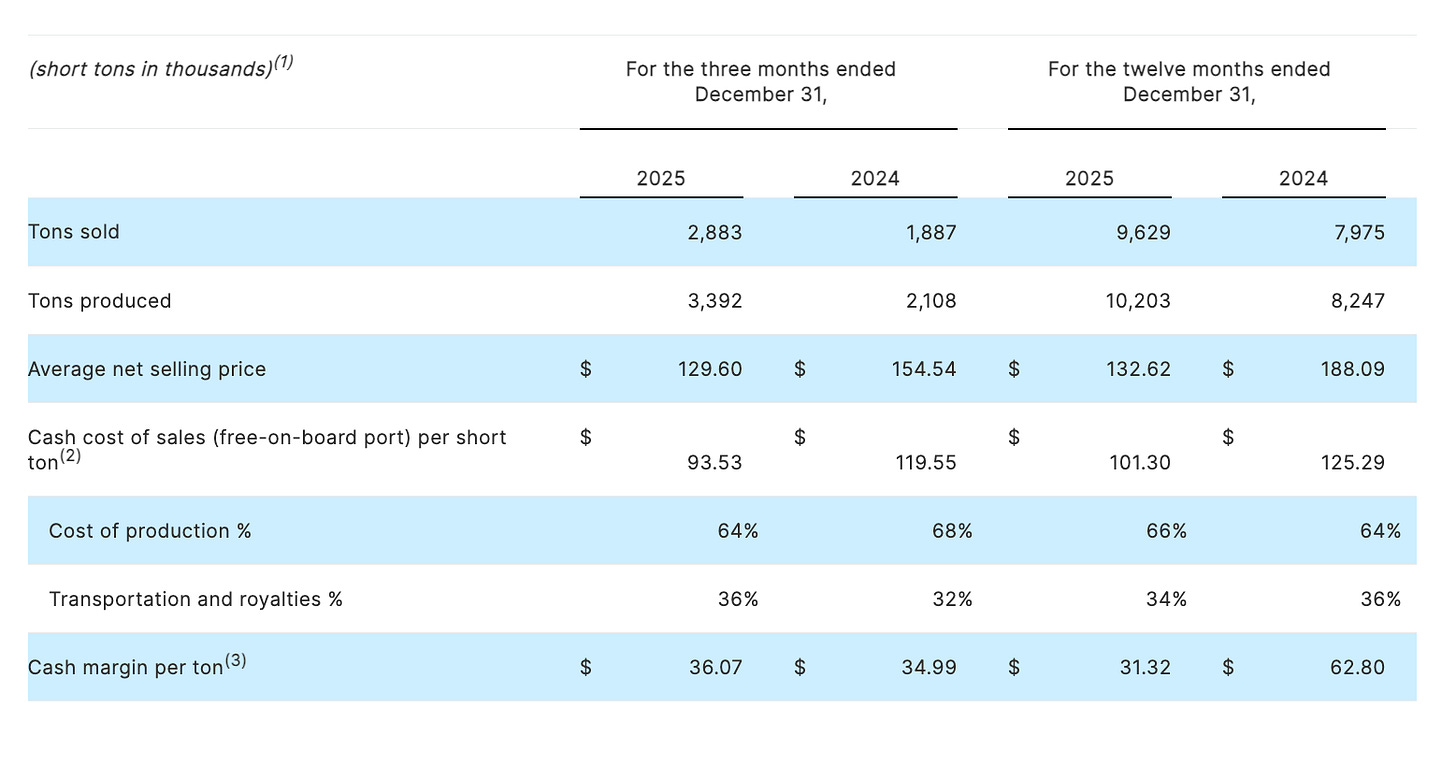 In Q4 2025 versus Q4 2024, sales volumes increased 53 percent to a record 2.9 million short tons. Production surged 61 percent to 3.4 million short tons. Cash cost per ton fell 22 percent — from $119.55 to $93.53. Read those numbers slowly. In a quarter when the market was punishing everyone, Warrior simultaneously grew production, grew sales, and crushed its cost structure.